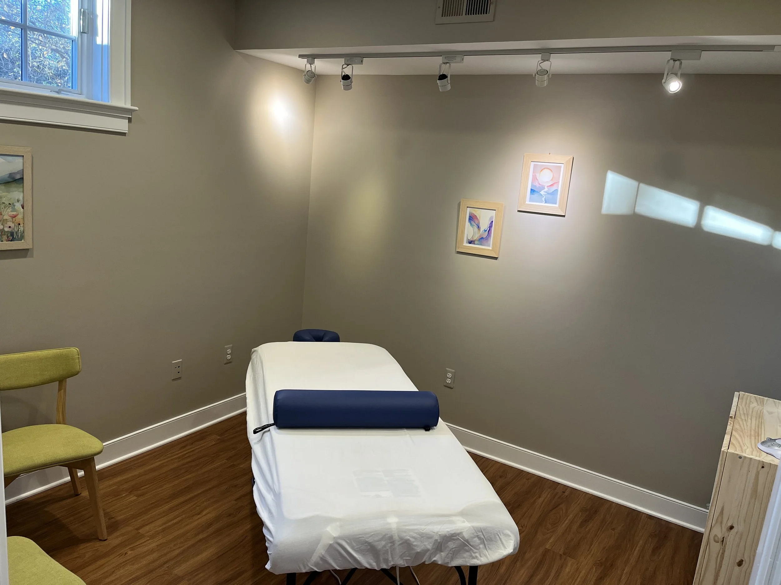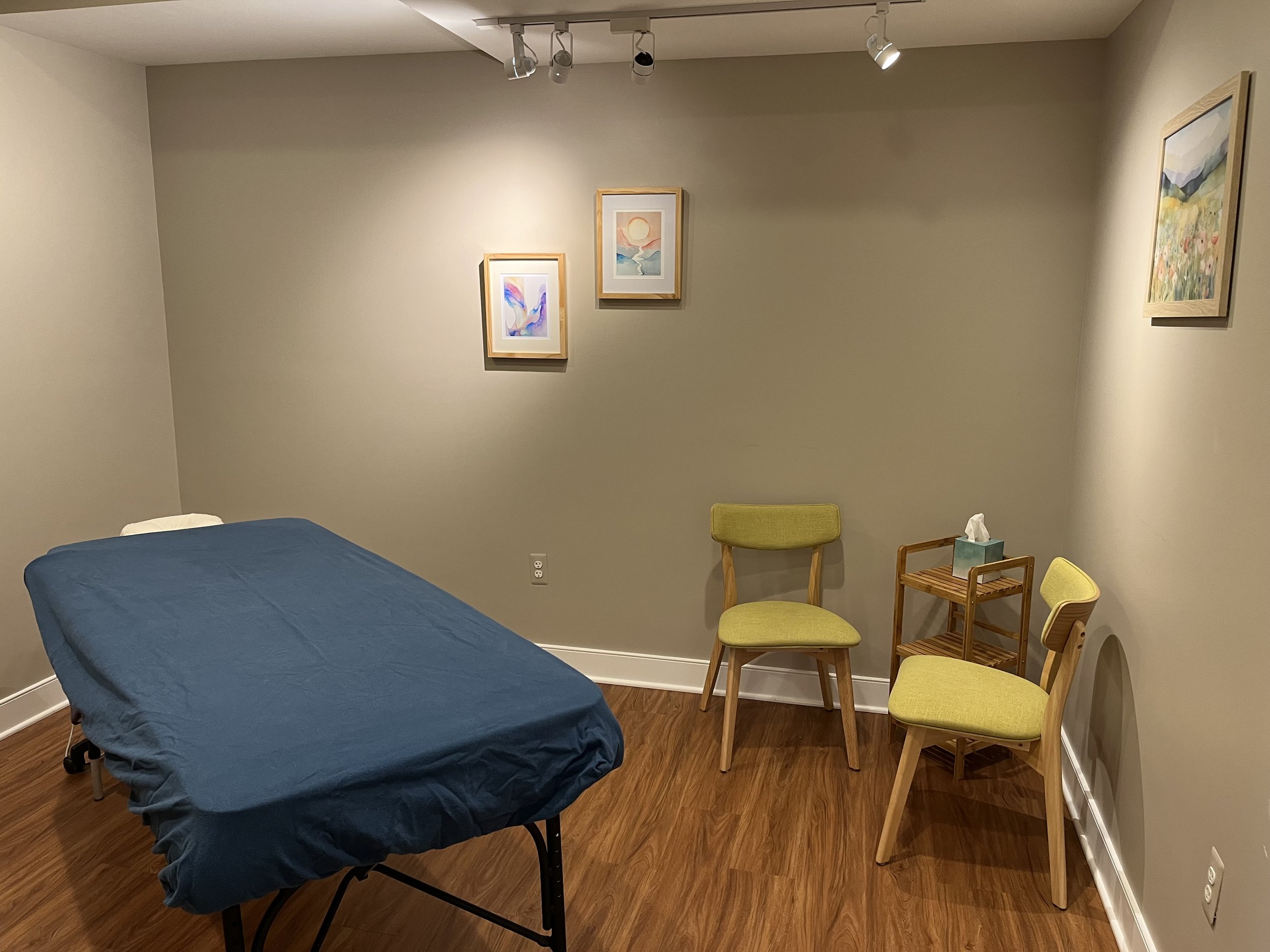 Our lower level features 1100 square feet of studio space with exquisite lighting and two private treatment rooms. Each room has been carefully and deliberately decorated to create an environment ideal for private treatments and healing work like massage or reiki. Rental of either treatment room includes access to the bathroom and a small and discreete kitchenette. We offer complimentary dishes, water, and tea service in the kitchenette. Although we have WiFi in the building we intentionally do not have WiFi in the treatment clinic, access may vary. Individual differences between the rooms can be seen below.